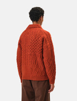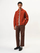 The Beams Plus Alan cardigan is a cheerful patchwork sweater in vibrant orange, crafted from cozy Shetland wool. Perfectly mid-weight, it’s just right for layering through all seasons with a playful twist.