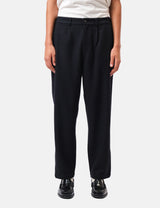 The Barbour Wool Blend Relaxed Trousers in navy blue offer a modern style ideal for pairing with a simple tee or a crisp shirt. Designed with a lower rise and an elasticated back waist for added comfort, they feature a distinctive tartan trim inside the waistband, showcasing the iconic Barbour detail.