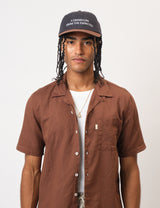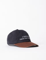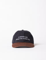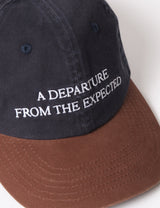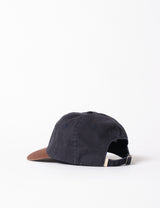 Presenting the Bhode "A Departure From The Expected" cap in a washed black and brown finish. Crafted with a six-panel design, it features embroidered ventilation eyelets for breathability and a metal adjuster at the back for a customised fit.