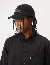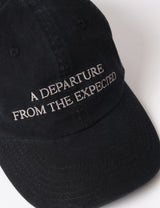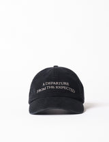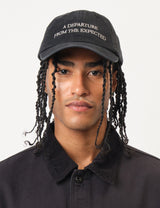 Presenting the Bhode "A Departure From The Expected" cap in a washed black finish. Crafted with a six-panel design, it features embroidered ventilation eyelets for breathability and a metal adjuster at the back for a customised fit.