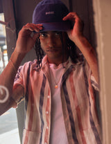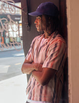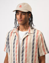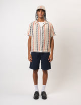 This Bhode textured cuban collar short sleeve shirt is made with two front pockets, an open cuban collar and straight hem line. The bold stripe in red and navy blue sit on this stone coloured textured shirt.