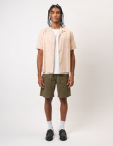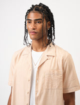 Summer ready. The Bhode Cuca Seersucker stripe short sleeve shirt is made with a rust and white stripe. Made in cotton seersucker fabric known for its breathability, is perfect for summer, with a regular fit and cuban style collar and finished with one chest pocket and Bhode tab branding.