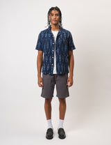 Say hello to the Bhode short sleeve Ikat shirt, the classic blurred lines created by dyeing threads in the weave. Made in a navy blue with orange and white ikat pattern, this striking shirt is timeless and made in a breathable cotton. Featuring side entry chest pockets, cuban open collar and button placket.