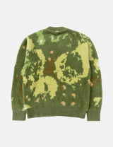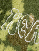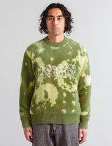 The green Heresy Mould Knit is a cozy crew neck jumper with a fuzzy mohair vibe. It showcases a bold 'Mould' print alongside 'Heresy' embroidered in crisp white thread. Designed with an oversized fit, this jumper is crafted from 100% nylon yarn for a soft, playful touch.