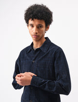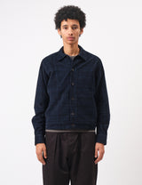 The Universal Works Uniform Check Jacket is back from the archive and in style! Made with narrow cord seersucker in navy blue, this short and snug overshirt has a trucker-style shape and large pockets perfect for all your tools and supplies. Grab one for your next creative adventure!