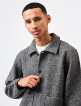 Introducing the Universal Works Rams Jacket made in grey marl wool fleece. A new take on a chore jacket, this has a wider, more boxy modern shape with pared-back styling. Well proportioned, including two large patch pockets, giving this a clean contemporary look.