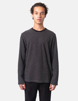 Meet the Folk Textured Stripe long sleeve tee in black with a cheeky ecru stripe. Heavier than your average shirt, it features a loop jersey fabric that’s delightfully textured. Cozy and cool, this long sleeve is your go-to for those chillier days when you want some extra style and warmth.
