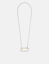 Meet the Aries Mini carabiner chain necklace in shiny silver-plated brass. Inspired by the industrial clips used in rock climbing, its pendant's clasp cleverly doubles as Aries' famous column logo, an iconic nod to the ancient temple design the brand loves to showcase. It’s jewellery with a fun twist.