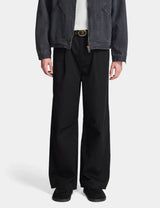 The generous wide-leg silhouette is defined by front pleats, while reinforced waistband construction and triple-stitched seams ensure lasting quality. Distinctive copper star rivets and a signature Larriet shank button add refined character, complemented by a zip fly and generously proportioned front rounded pockets.