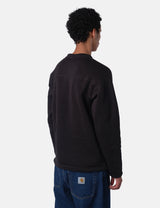 Cozy, cuddly, and built to last, the Patagonia Better Sweater Crewneck in black with blue detailing is crafted from 100% recycled fabric and colored using an eco-friendly process that saves dye, energy, and water compared to regular heather dyeing.