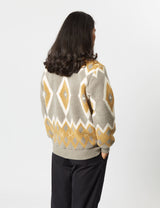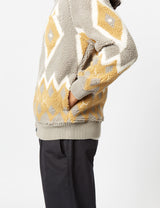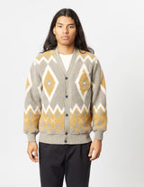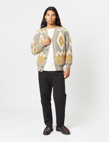 The Boa cardigan in light grey and mustard from Beams Plus. The light grey and mustard jacquard design nods to classic heritage vibes, with ribbed cuffs and hem for added insulation.