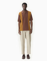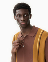 Beams Plus Knit Polo Shirt Stripe in brown. This retro style cotton polo shirt gives summer holiday vibes. With it's classic mustard and brown vertical stripe detail, and ribbed cuffs finished with traditional plain back. Made in a regular fit, and cut straight on the hem line.