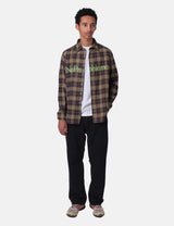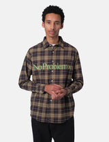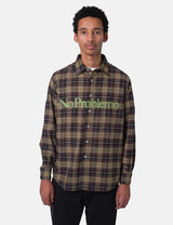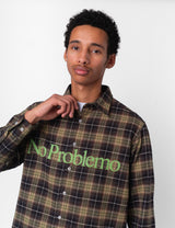 Meet the No Problemo Plaid Shirt, crafted from cozy flannel in a vibrant green, red, and black check pattern. It features playful No Problemo script branding across the chest, with classic details like a regular collar, cuffs, and button placket for a laid-back, stylish vibe.