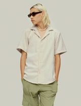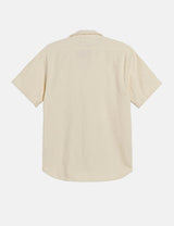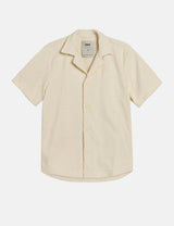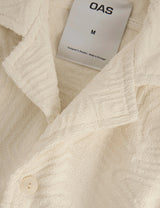 The OAS Golconda Cuba terry shirt in Ecru features a unique labyrinthine design, crafted from cozy midweight cotton terry. With a resort collar and front buttons, this shirt is both stylish and breathable!