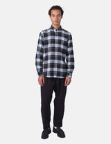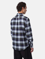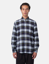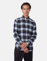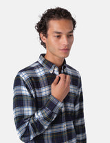 This Portuguese Flannel Marao heavy flannel shirt mixes navy blue, green, white and yellow in a lively plaid design. It’s woven for a cozy, relaxed fit and topped with Ureia buttons and a smart button-down collar, perfect for adding a splash of fun to your casual wardrobe.