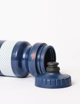 The Explore Bidon 625ml water bottle in navy from Rapha. Stay hydrated through life's adventures, this main containers is constructed in BPA-free plastic which is 100% recyclable. Featuring an easy-to-open cap which is leak-proof, a squeezable body and it's even dishwasher safe. Everything you need to quench your thirst, in two sizes and all the style needed for any journey!