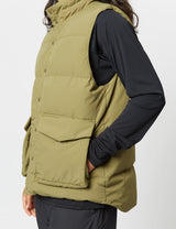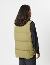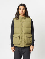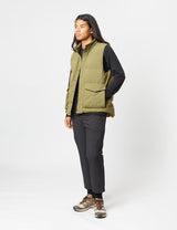 The recycled down vest in olive green, from Snow Peak. Stay warm in wet conditions without compromising on sustainability with this recycled down vest.