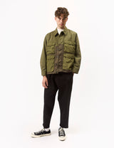 The Universal Works Parachute Field Jacket Ii. Made in olive green twill cotton fabric, this military inspired short jacket is stylish yet versatile. Completed with large utilitarian front pockets, a concealed button placket and two tone olivegreen patchwork style cotton.