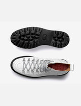 Nanette is Grenson's our signature hiking boot which feature cross over lacing and a lightweight Commando rugged rubber winter ready sole. The white softie calf is a very forgiving and unique material, the name speaks for itself - these boots are soft with reflective laces and a black welt and sole - you won't go unnoticed in these boots.