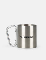 The No Problemo Carabiner Mug in sleek silver features durable stainless steel construction and is etched with the No Problemo phrase alongside the Alien-O logo. Its unique handle doubles as a handy carabiner for easy transport.