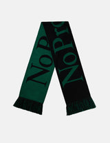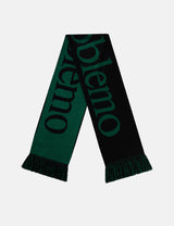 The iconic No Problemo scarf comes in green with striking green contrast. Inspired by vintage football style, it sports bold script lettering and fun fringed edges for that extra flair.