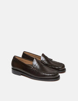 The classic G.H. Bass Weejun II penny loafer shines in a glossy Chocolate Brown leather, crafted with the same hand-sewn methods dating back to 1936. Perfect for smart weekend vibes, these timeless shoes pair effortlessly with everything from casual jeans and a blazer to laid-back blue suits. Step into heritage style with a playful twist!