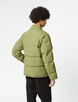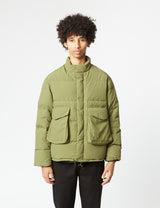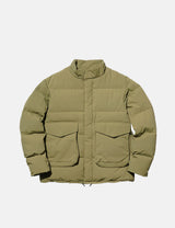 The Snow Peak Recycled Down Jacket is a technical winter layer that features a water-repellent outer shell constructed from 100% tent-recycled nylon ripstop with a DWR finish, and recycled down filling from the Green Down Project, making it a sustainable option.