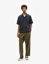 The Universal Works Tech overshirt in navy blue, a tightly woven blend of cotton, has a slight technical touch but is still incredibly comfortable to wear. It's water-resistant yet highly breathable. Made exclusively for Universal Works.