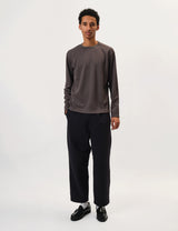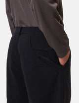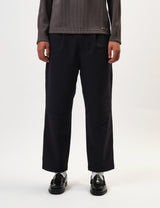 The Snow Peak Easy Cloth Pants in dark navy blue bring roomy tool pockets and a comfy, tapered fit with a one-tuck waist, giving you plenty of space and freedom to bend your knees.