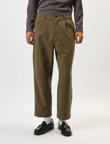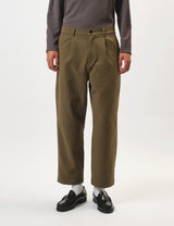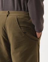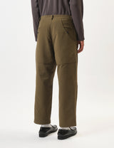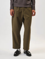 The Snow Peak Easy Cloth Pants in olive green bring roomy tool pockets and a comfy, tapered fit with a one-tuck waist, giving you plenty of space and freedom to bend your knees.