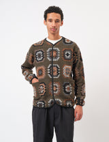 The Snow Peak Wool Jacquard Cardigan in olive green features a detailed jacquard texture that provides warmth suitable for outerwear on chilly days, while remaining light and flexible enough for layering. Its roomy, boxy silhouette offers a relaxed fit, ensuring comfort and freedom of movement.