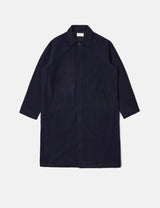 Step into timeless style with the Universal Works Mowbray Wool Mac Coat in classic navy blue. Perfect for lovers of classic Mac designs, this coat falls just below the knee, featuring a hidden front placket, comfy raglan sleeves, and two trusty hand-warmer welt pockets.