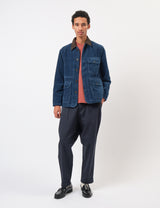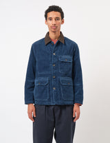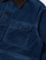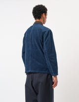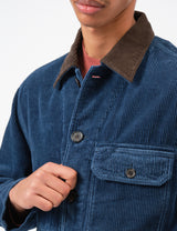 The Universal Works Utility Jacket (Cord) in indigo blue is a laid-back chore jacket with a cool contrast collar.