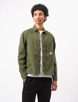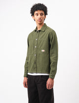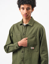 Introducing the Bhode Map Pocket Overshirt Twill made in a Army green hue. With its 350 gsm cotton twill fabric and seasonal Mên-an-Tol Bhode label on the chest pocket, this versatile overshirt combines classic workwear style with a boxy fit.