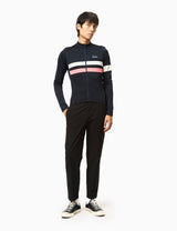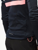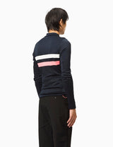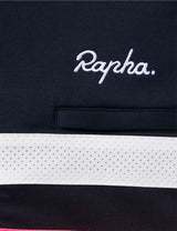 This Rapha Brevet jersey in dark navy blue features sports tripe in hi-vis pink and white. A classic-cut Merino jersey for those wanting to go the distance: 185gsm circular knit keeps you toasty in mild temps, three pockets on the back provide space for all your needs, while the added draw cord helps you customise the fit. Plus, reflective perforations across the body and sleeve keep you visible!