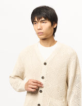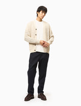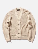 The Beams Plus Argyle Mesh Cardigan in beige. Another heritage style knitwear piece from Beams, made with an allover mesh knit with a argyle pattern throughout. The attention to detail is outstanding, finished with Beams branding button placket, two front pockets and ribbing on the hem and cuffs.