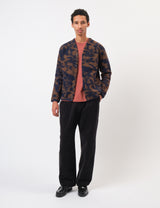 This Universal Works Cardigan features a playful studio pattern dark navy and brown. A signature piece, it sports a neat buttoned front with self-bound edges, plus three outer patch pockets and an extra one inside for your little treasures.