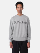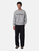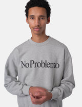 The No Problemo sweatshirt in grey marl is crafted from soft brushed back fleece jersey, perfect for chilly days. This cozy must-have showcases a bold 'No Problemo' print across the chest. With its regular fit, ribbed cuffs, and hem, it's the go-to for comfy, casual style with a cheeky vibe.