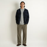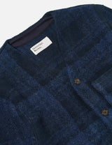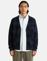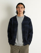 Discover effortless layering with this Universal Works cardigan, crafted in a sophisticated navy blue with a subtle check pattern. The relaxed silhouette features a convenient button front, generous patch pockets, including a hidden interior pocket, and finished with soft cotton ribbing at the cuffs and hem.